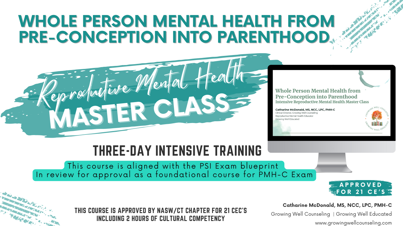 PSI-Applicability: This course is under review by PSI as a foundational PMH training (exam eligible), an advanced training, and is approved for PMH-C continuing education. This course does include >6hrs of psychotherapy training toward the advanced credential and is intended as a one-course preparation for the exam. For more information see: https://postpartum.net/professionals/certification/